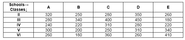 Directions (11-15): Given below is the table showing the average marks scored by students of five various classes of five different schools in annual examination. Study the table carefully and answer the questions based on it.