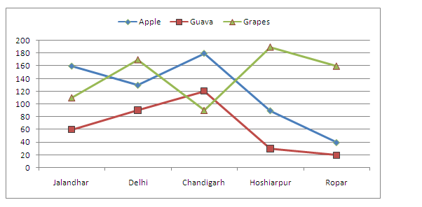 Cost of three different fruits (in rupees per kg.) in five different cities.