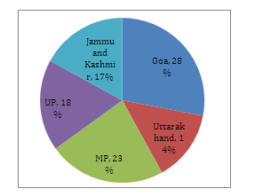 Percentage break up of foreigners who toured of various states of India and the ratio of men to women in them
