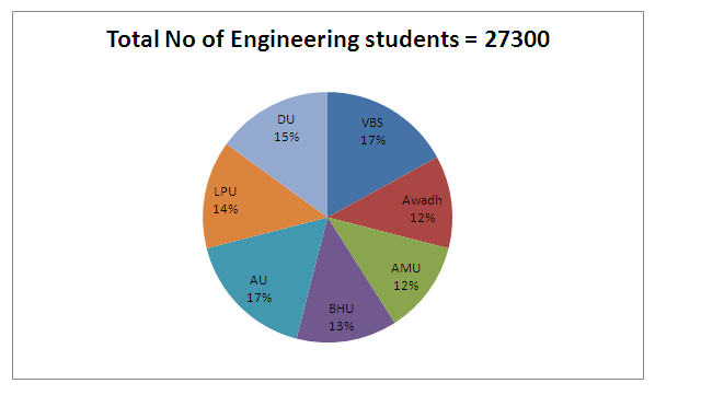 Q3. What will be the difference between the average no of students of Arts from AU ,AMU , Awadh& VBS Universities and average no of students of Engineering from top 5 universities according to no of students enrolled?