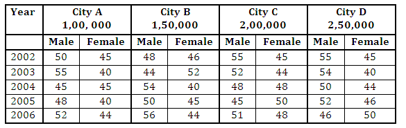 Directions (11-15): In the following table the percentage of male and female candidates of four different cities with their total population in five different years is given. Rest population is of transgenders.