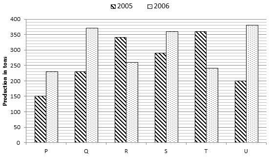 Given below is the bar graph showing the production of rice by 6 firms. P, Q, R, S, T and U in two consecutive years 2005 and in 2006.
