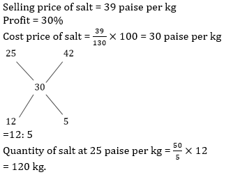 Q5. How many kg of salt at 25 paise per kg must be mixed with 50 kg of salt costing 42 paise per kg so that a merchant will get a profit of 30% by selling the mixture at 39 paise per kg?