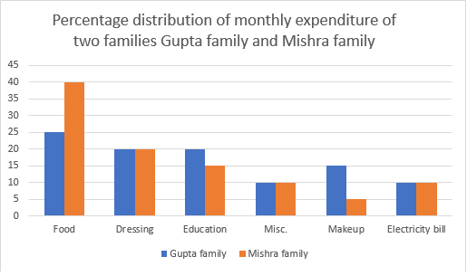 Directions (6-10): Following bar diagram shows the monthly expenditure of two families i.e. Gupta family and Mishra family on food, dressing, education, make up, electricity bill and miscellaneous (in percentage).