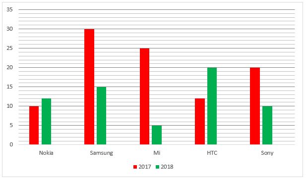 Q3. No. of HTC mobile sold in 2018 are how much more/less than no. of Sony mobile sold in 2017?