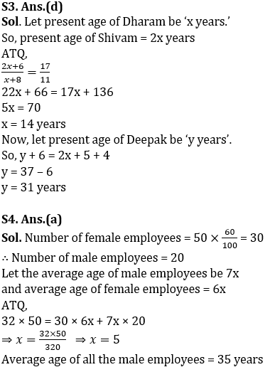 Q4. Average age of all the employees in a company is 32 years. 60% of the employees in the company are female and the ratio of the average age of all female to average age of all male employees is 6 : 7. Find the average age of all the male employees if there are total 50 employees in the company.