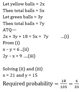 Q8. In a bag there are three types of colored balls i.e, yellow, green and Red. The probability of getting one yellow ball is 2/5 and the probability of selecting one green ball is 3/7. If total number of Red balls are 18 then find the probability of selecting one red ball.