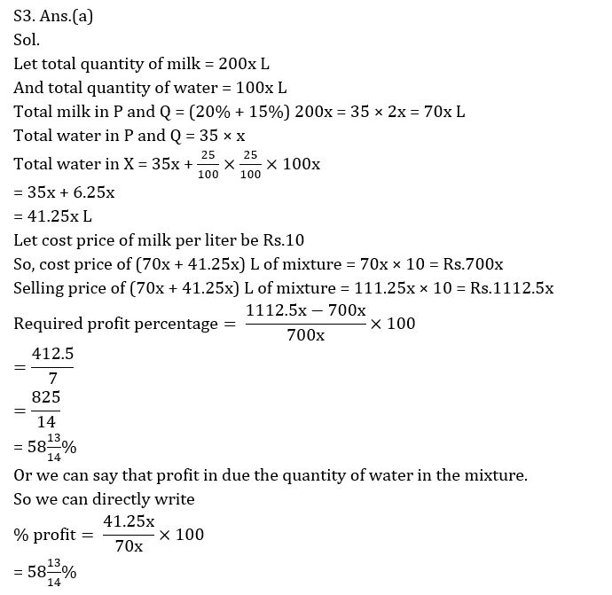 Q3. A shopkeeper pours the mixture of vessel A and B into another vessel F. Vessel F contains water only which is equal to 25% of water of vessel B. If shopkeeper professes to sell the whole mixture at the cost price of pure milk and cost price for shopkeeper is due to milk only, then find the percentage profit of shopkeeper in selling whole mixture.