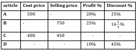 Directions (1-5): Table given below gives information about Cost price, Selling price, profit percent and discount percentage of four article A, B, C and D. Some data is missing, calculate the data and answer the following questions.