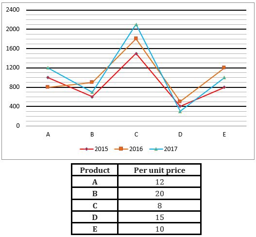 Line chart shows the number of units sold of five different articles (A, B, C, D and E) in 3 different years (2015, 2016 and 2017) and table shows per unit price of these articles in these years.