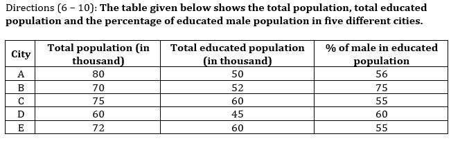 Q10. The total population of city F is equal to the average of educated population of all the five cities. In city F, 66⅔% of total population are unemployed and 40% of the employed population are females. Then find the number of employed male in city F.