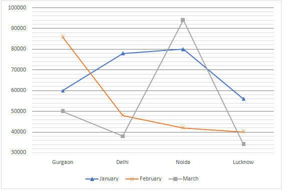 Directions (11-15): The given Line graph Data Interpretation Chart shows the sales of masks in four different cities Gurgaon, Delhi, Noida, Lucknow during three consecutive months January, February and March. Study the graph carefully and answer the questions given below.