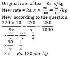 Q5. Due to decrease of 10% in the price of tea per kg, a consumer buys 250 gm of tea more than before for Rs. 270. What is the original price of tea?