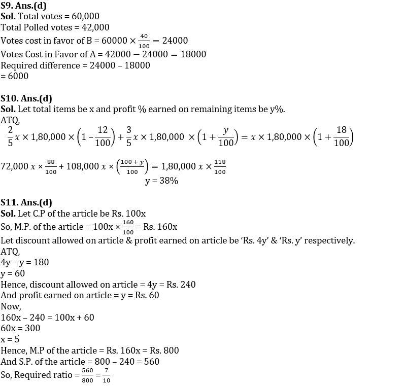 Q11. A shopkeeper marked his article 60% above the cost price and ratio of discount allowed to profit earned is 4 : 1. If profit earned is Rs.180 less than discount allowed, then find ratio of selling price to marked price of the article.