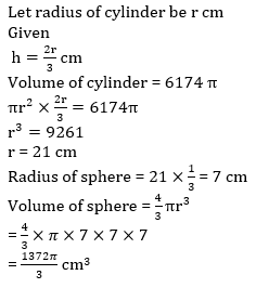 Q3. Volume of a cylinder is 6174π cm3, if the ratio between the radius and the height of cylinder is 3 : 2. Find the volume of a sphere, if the radius of the sphere is 33⅓% of the radius of cylinder?