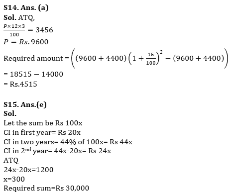 Q14. A man received Rs.3456 when he invested Rs. P at 12% p.a. at SI for 3 years. If he invested Rs.(P + 4400) at 15% p.a. at CI compounding annually for 2 years, then find the interest received by him.