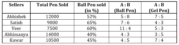Directions (11-15): Table given below show the distribution of Pens of two companies (A and B) sold by five sellers. In this some are Ball pen and remaining are Gel pen. Study the data carefully and answer the following question.
