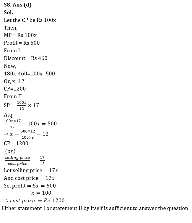 Q8. A shopkeeper marked up an article 80% above the cost price and after providing some discount, sold it at a profit of Rs 500. Find the cost price of that article.