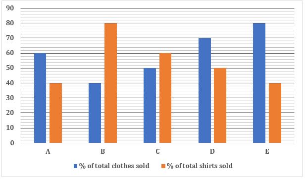 Bar graph given below shows total number of clothes sold out of total number of clothes manufactured by five different companies (A, B, C, D & E) and percentage of shirts sold out of total number of clothes sold by these five companies.