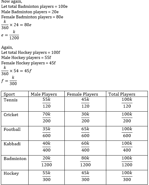 Directions (1-6): Given pie chart shows the distribution of female players of various sports (in degrees) while given table shows the data of male players as percent of total players of that sport. Read the data carefully & answer the questions.
