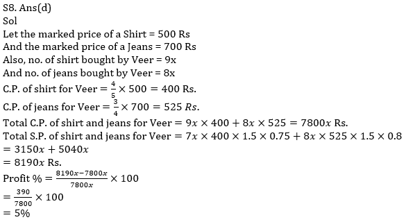 Q8. Veer bought some Shirts & some Jeans from a store. The marked price of a shirt and a jeans is in the ratio 5 : 7 and store allows discounts of 20% and 25% on the shirt & the jeans respectively. The ratio between number of shirt and jeans bought by Veer is 9 : 8. Veer marking up the prices of both by 50% on the price at which he bought and sells each shirt and jeans bought by him at discounts of 25% and 20% respectively. If Veer gives one 1 shirt free for every 4 jeans bought by a customer, then what is the net profit made by Veer after selling all of the items which he bought from the store?