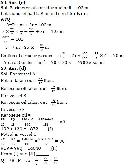 Q8. In a house , there is a semicircular corridor, a circular hall and a circular garden. Sum of perimeter of corridor and hall is 102 m.If radius of hall is 50% more than radius of corridor then find area of circular garden, given radius of garden is 300% more than sum of radius of corridor and radius of hall together.