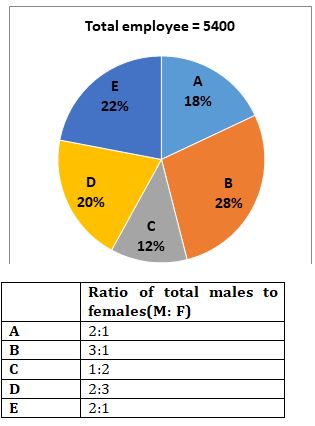Pie chart shows the percentage distribution of total employee in 5 different companies as shown below and table shown below shows the ratio of males to females in these 5 companies.