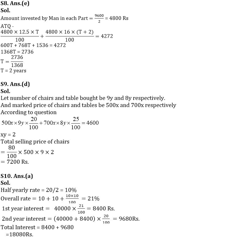 Q8. A man invested Rs. 9600 in two equal parts on SI for T years and (T + 2) years at the rates of 12.5% p.a and 16% p.a respectively. If the man got a total interest of Rs. 4272, then find the value of T.