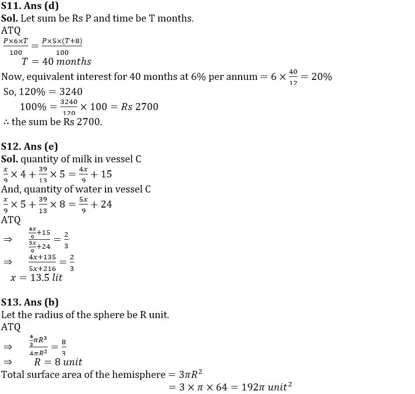 Q11. A and B lent equal amount of money at simple interest at the rate of 6% and 5% per annum at the same time. A recovered his amount 8 months earlier than B and the amount recovered in each case is Rs 3240. What is the sum?