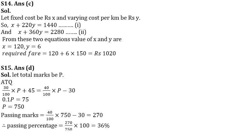 Q14. The taxi fare in a city comprises of fixed charge and variable charge which varies according to the number of kilometers travelled. In a journey of 220 kms, a person is charged Rs. 1440, while for another journey of 360 kms, he is charged Rs. 2280. Then find the fare for a journey of 150 kms.
