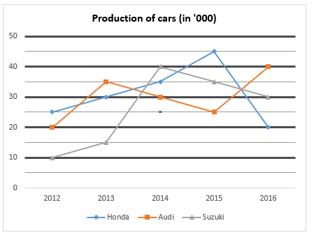 Line-graph shows the production of cars i.e. Honda, Audi and Suzuki cars (in thousands) in 5 different years.
