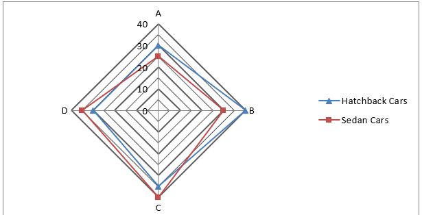 The given radar graph shows the production data of hatchback & sedan cars by 4 companies (A, B, C & D) in a month.
