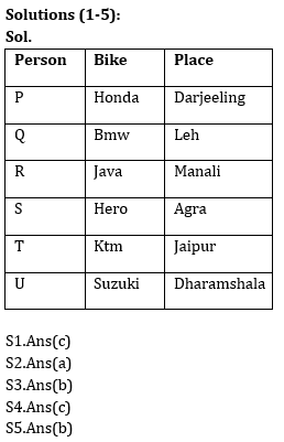 R rides Java and he is from Manali. The one who rides Suzuki is not from Jaipur and Leh. P is from Darjeeling. The one who is from Agra rides hero. T rides Ktm. The one who is from Leh doesn’t ride ktm. U isn’t from Leh. P doesn’t ride Bmw and Suzuki. S is not from leh and Dharamshala.
