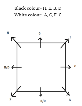Directions (6-10): Study the following information carefully to answer the given questions A, B, C, D, E, F, G and H are eight children who are sitting around a Square table such that four of them sits on the corner and four on the middle of the sides and all of them face away from the center. They all either likes black or white colour.