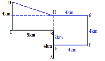 Akash starts walking towards north direction from point A. After walking 4km he reached point B then turns towards his left and walks 5km to reach point C. Then he turns towards his right and walks 4km to reach point D. Rahul starts walking from point E, which is mid-point of AB. Then he walks 4km towards east direction and reached point F. From there he turned towards his left and walks 4km and reached point G. From point G he turned towards his left and walk 4km to reach point H.