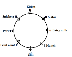Eight friends i.e. A, B, C, D, E, F, G and H have seated around a circular table. Four of them faces towards Centre and rest faces opposite to centre. They like different chocolates i.e. Perk, Munch, Dairy milk, Snickers, Fruit n nut, Kitkat, Silk and 5-star. A sit opposite to D, who likes Kitkat. G does not like Perk. E sits 3rd right of D, who faces outside. There is one person sits between D and F, who is not an immediate neighbor of E. The one, who likes 5-star sits 3rd right of F. B is an immediate neighbor of D and sits 2nd right of E. The one, who sits opposite of E is H, who likes Snickers. H faces towards centre. C, who likes Fruit n nut is neighbor of A. The one, who likes Perk sits opposite of the one, who likes Dairy milk. G faces the direction, opposite of F’s direction. The immediate neighbors of A, faces towards centre. E likes Munch.