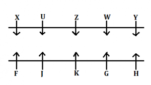 Ten persons are sitting in two parallel rows containing 5 person each, in such a way that there is an equal distance between adjacent persons. In row-1 U, W, X, Y and Z are sitting and all of them are facing South. In row-2 F, G, H, J and K are sitting and all of them are facing North. Therefore, each person sits in a row faces another person of other row.