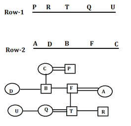 There are ten members P, U, T, R, Q, A, B, D, F, C in a family, all are seated in 2 parallel rows (but not necessarily in the same order). Among them only three married couples. P, U, T, R, Q are seated in row-1 and all are facing to the south. A, B, D, F, C are seated in row-2 and all are facing to the north. Therefore, in the given seating arrangement each member seated in a row faces another member of the other row.