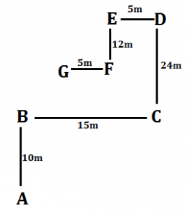 Point B is 10m north of A. Point C is 24m south of D which is 5m east of E. Point G is 5m west of F. Point C is 15m east of B. point F is 12m south of point E.