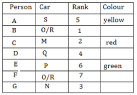 Seven persons A, B, C, D, E, F, and G likes different Sports car i.e. M, N, O, P, Q, R, and S, also they got different ranks in car racing from 1 to 7 (but not necessarily in the same order). They like the different colour. Some of them like colours.