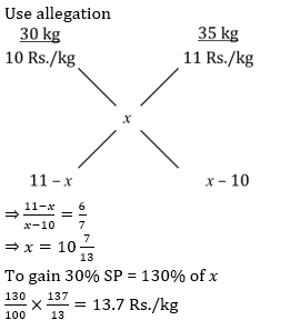 Q4. Suryawansh purchased 30 kg of rice at the rate of Rs. 10 per kg and 35 kg at the rate of Rs. 11 per kg. He mixed the two. At what price per kg (in Rs.) should he sell the mixture to make a 30% profit in the transaction ?