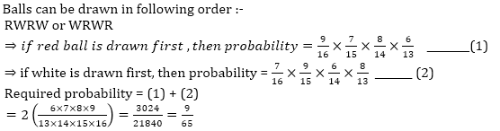 Q8. A bag contains 9 red and 7 white balls. Four balls are drawn out one by one and not replaced. What is the probability that they are alternatively of different colours?