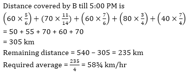 Q4. If B have to cover a distance of 540 km till 9 : 00 PM, even after having a rest of 45 minutes between 5 : 00 to 5 : 45 PM. What should be his average speed for 4 hours between 5:00 PM to 9:00 PM.