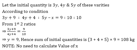 Q10. There are three varities of sugar with their quantity in the ratio of 3 : 4 : 5. If 9 kg of first variety and 4 kg of second variety are added to their respective quantity and x kg of 3rd type is removed from it, then final ratio becomes 9 : 10 : 10. Find the sum of initial quantities of these varieties.