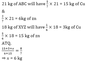 Q9. An alloy ABC have Cu : Zn in 5 : 2 and another alloy XYZ have Cu : Zn in 1 : 5. If 21 kg of ABC is melted with 18 kg of XYZ and x kg of Cu is added to new mixture then in resultant mixture Zn : Cu is 7 : 8. Find the value of x.
