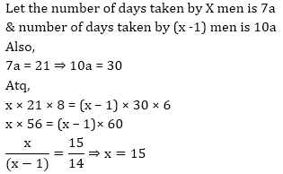 Q6. X men can do a piece of work in 21 days working 8 hours each day. The number of days taken by X men is 70% of number of days taken by (x – 1) men, working 6 hours a day. Find the value of X.