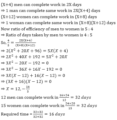 Q8. (X+4) men can complete a work in 2X days while (X+12) women can complete same work in (X+8) days. If ratio of efficiency of men to women is 5 : 4 then find in how many days 12 men and 15 women together can complete the same work?