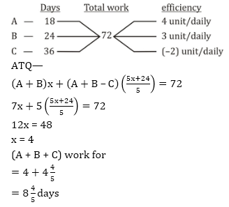 Q7. A can do a task in 18 days, B can do the same task in 24 days and C can destroy the whole work in 36 days. If A & B work for first x days together after that C also joined them, remaining work is completed in days. Find how many days all three worked together?