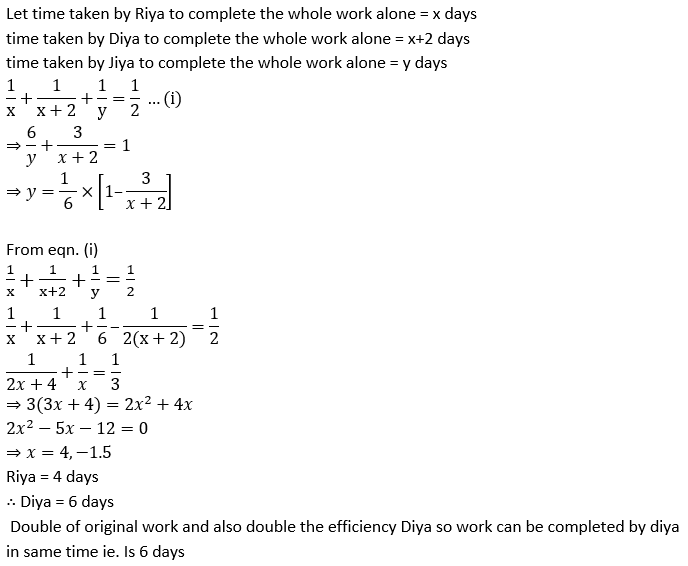 Q4. Jiya, Diya, and Riya are three friends. Diya takes 2 days more than Riya to complete the work. If Jiya started a work and 3 days later Diya joins her, then the work gets completed in 3 more days. Working together Jiya, Diya and Riya can complete thrice the original work in 6 days. In how many days Diya can complete twice the original work with double the efficiency working alone?