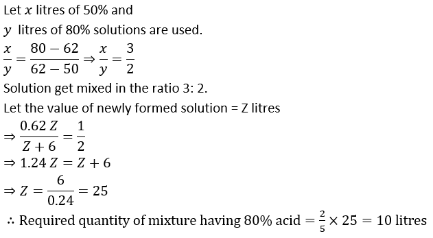 Q1. There are two solutions of Sulphuric Acid (acid + water) with concentration of Acid 50% and 80% respectively. They are mixed in a certain ratio to get a 62% sulphuric acid solution. This solution is mixed with 6 litres of water to get back 50% solution. How much of the 80% concentration solution has been used in the entire process?